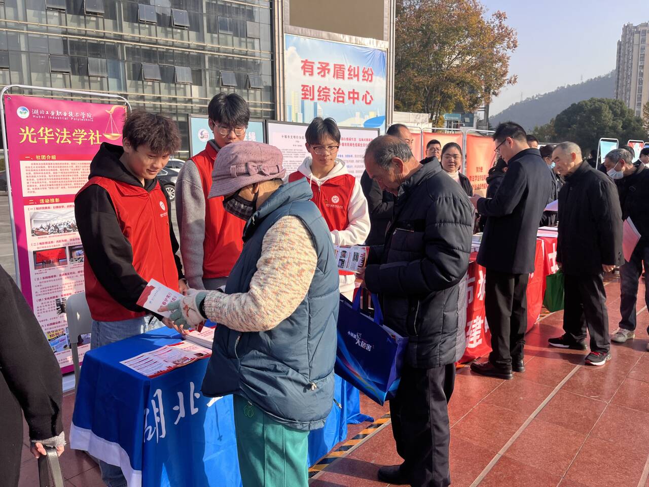 (文/图 程思嘉 袁李红)为深入学习宣传贯彻党的二十届四中全会精神和习近平法治思想,12月1日上午,2025年十堰市第八个“宪法宣传周”启动仪式暨集中法治宣传活动在市人民广场隆重举行。湖北工业职业技术学院的教师代表与光华法学社的学生志愿者们积极响应,通过发放精心编制的宣传手册、为群众答疑解惑等形式以青春之力赋能普法实践,为这场全市性的法治宣传活动注入了鲜活的青年力量。