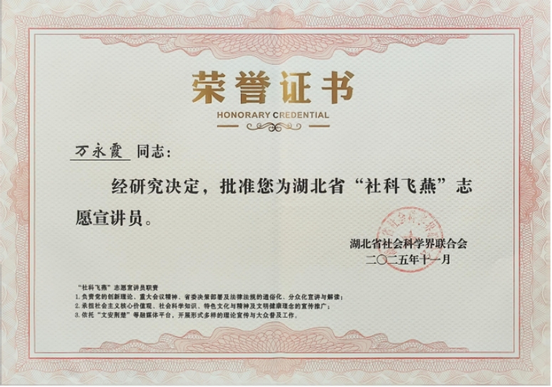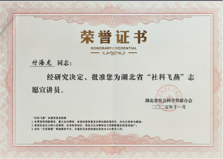 (通讯员 王洁)近日,湖北省社会科学界联合会公布了湖北省“社科飞燕”志愿宣讲员名单,我校马克思主义学院付海龙、万永霞同志被聘为湖北省志愿宣讲员。