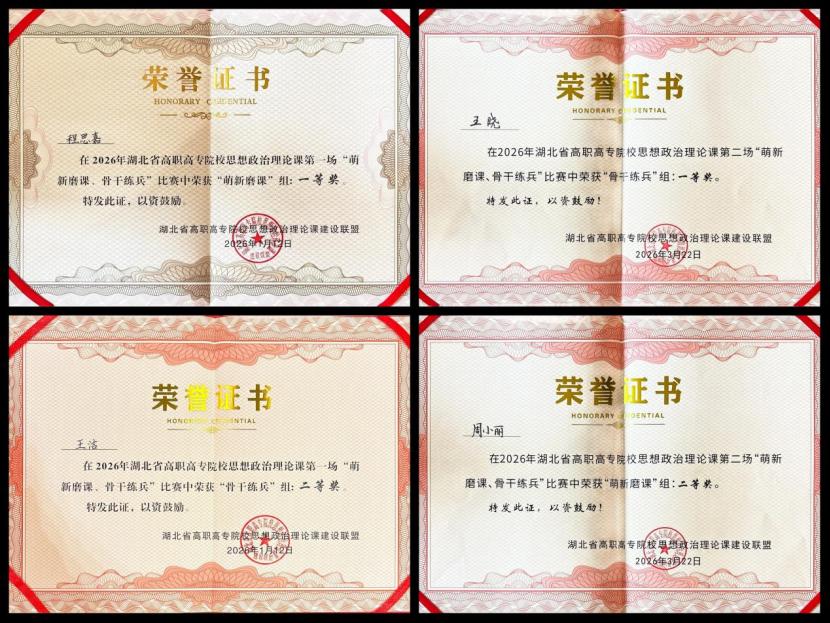 (文/黎苏晓 图/王晓)近日,2026年全省高职高专院校思想政治理论课“萌新磨课、骨干练兵”第二场教学展示比赛在武汉举行。我校思政课教师王晓、周小丽代表学校参加比赛。经过材料评审、现场展示等环节,王晓最终获得《毛泽东思想与中国特色社会主义理论体系概论》课程“骨干练兵”组一等奖,周小丽获得“萌新磨课”组二等奖。在之前结束的2026年第一场的比赛中,程思嘉、王洁分别获得《思想道德与法治》课程一等奖、二等奖。
