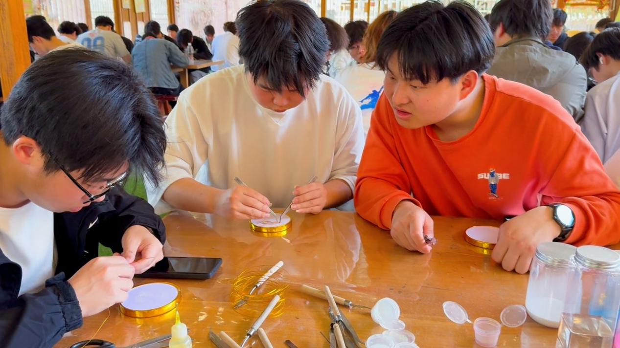 下午,实践队伍前往忆乡坪生态园开展文化实践学习。园区内,师生深入了解本土非遗文化发展脉络,重点体验掐丝珐琅传统技艺。同学们亲手实操、静心创作,在动手实践中感受传统工艺的匠心魅力,将思政感悟与传统文化体验有机结合,实现精神滋养与文化浸润双向提升。现场学习氛围浓厚,学生纷纷表示,沉浸式实践让思政教育更生动、更入心,收获满满。