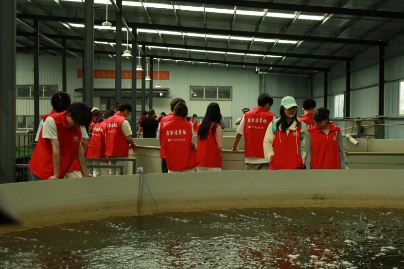奔富渔业基地内,60余个陆基生态养殖桶整齐排布,基地采用内循环系统实现养殖用水零排放,构建“鱼—橘—水”闭环生态模式。师生了解到,当地依托优质水源打造“丹江鲌”地理标志产品,构建起全产业链发展体系,将生态优势转化为发展优势。